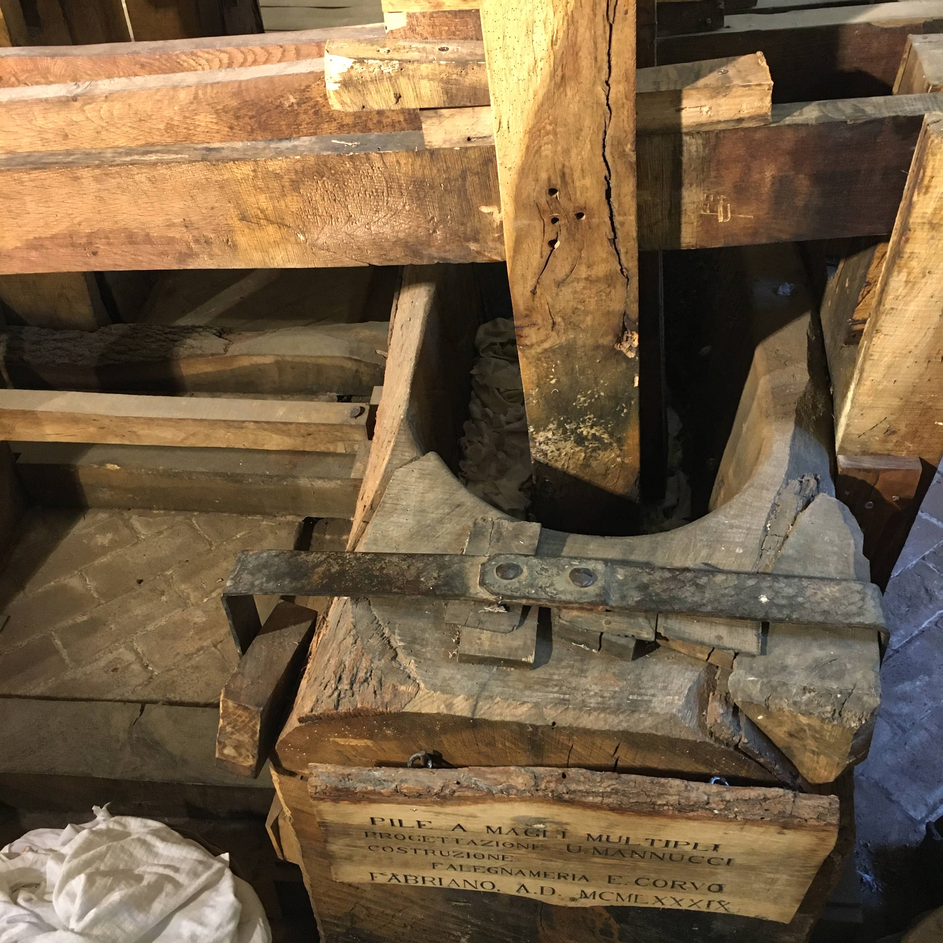 Un des maillets enfoncé dans la pile. Museo della carta e della filigrana, Fabriano.
