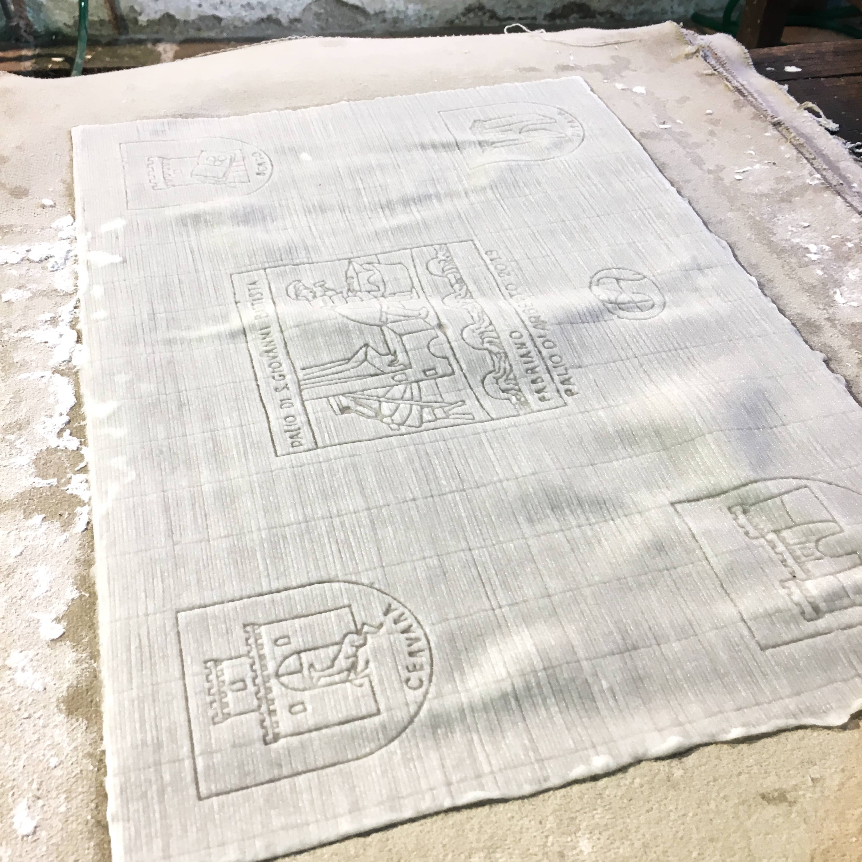 Forme avec filigranes représentant des motifs architecturaux, posée sur la cuve contenant la pâte à papier, et tout à droite le filigrane sur la feuille de papier à la sortie de la cuve. Museo della carta et della filigrana, Fabriano.