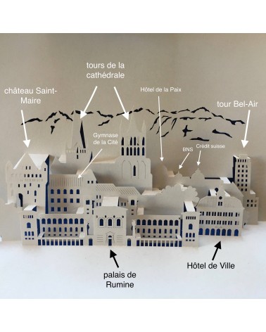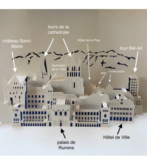 Une carte (exclusivité L'Ecritoire design) qui regroupe les bâtiments emblématiques de la Ville de Lausanne : la cathédrale, bien sûr, le château Saint-Maire, l'Hôtel de Ville, le palais de Rumine, et la tour Bel-Air. Ils sont tous là, avec les Alpes en arrière-plan, dans leur situation géographique (plus ou moins) correcte, sauf pour la tour Bel-Air: là, il a fallu tricher pour l'inclure sur la carte...  Voir la dernière photo, et pour une comparaison avec la réalité, cliquez ici !