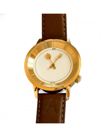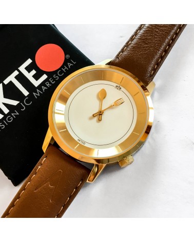 Une montre pour les passionnés de cuisine. Le rehaut doré indique la position des heures. Sur le cadran blanc, une auberge indique midi. Une cuillère indique les heures, une fourchette les minutes. Design Jean-Christophe Mareschal. Fabriqué à Besançon, mouvement à quartz Ronda. Garantie 2 ans.