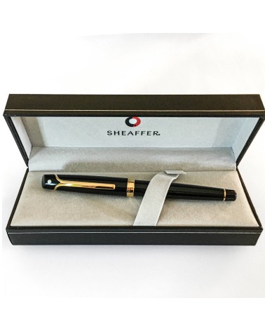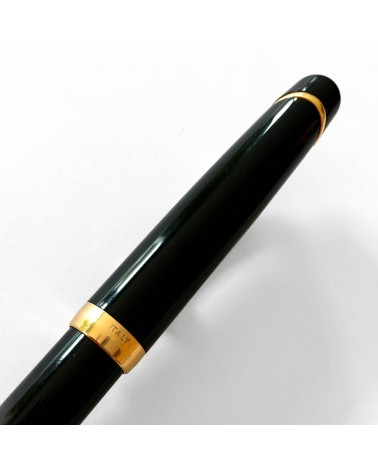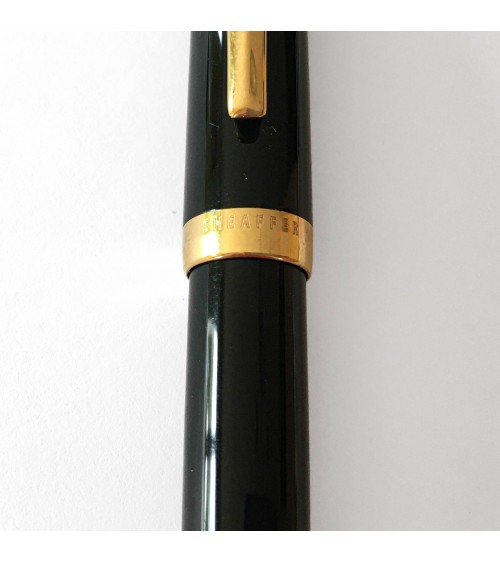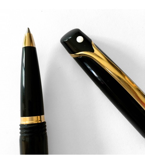 Roller exceptionnel de la marque Sheaffer, fabriqué en Italie (selon des rumeurs, par Aurora…). Le roller est en résine et donc léger dans la main, les attributs sont plaqués or 22 carats, le point blanc caractéristique de la marque se trouve au-dessus du clip. Sur l’anneau du capuchon sont gravés les mots « Italy » et « Sheaffer ». Le clip, d’une suprême élégance, se divise en deux à son sommet pour former un mince anneau qui encercle complètement le capuchon. Le roller est devenu rare !