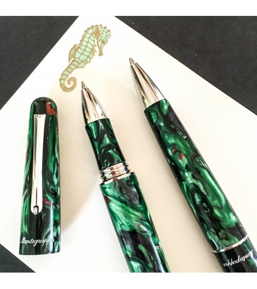 Le corps du stylo-bille Elmo 01 Fantasy Bloom Green est en résine à reflets chatoyants mélangeant différents tons de vert avec du noir et quelques éclats de rouge et de blanc. Au bout du clip, une petite roulette facilite le glissement sur le rebord de la pochette de chemise ou sur la couverture d’un cahier. La marque Montegrappa est gravée sous le bas du clip. Le stylo-bille peut être assorti au roller Fantasy Bloom Green, voir dernière photo.